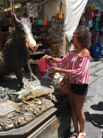 Along the way we stumbled across another market, I believe this was the old market. They had a statue of a boar with water running out of his mouth. This is known as Il Porcellino. It is said that if you put a coin in his mouth and it drops into the drain below it you will have good luck. It is also said to be lucky if you rub his snout… we did both.